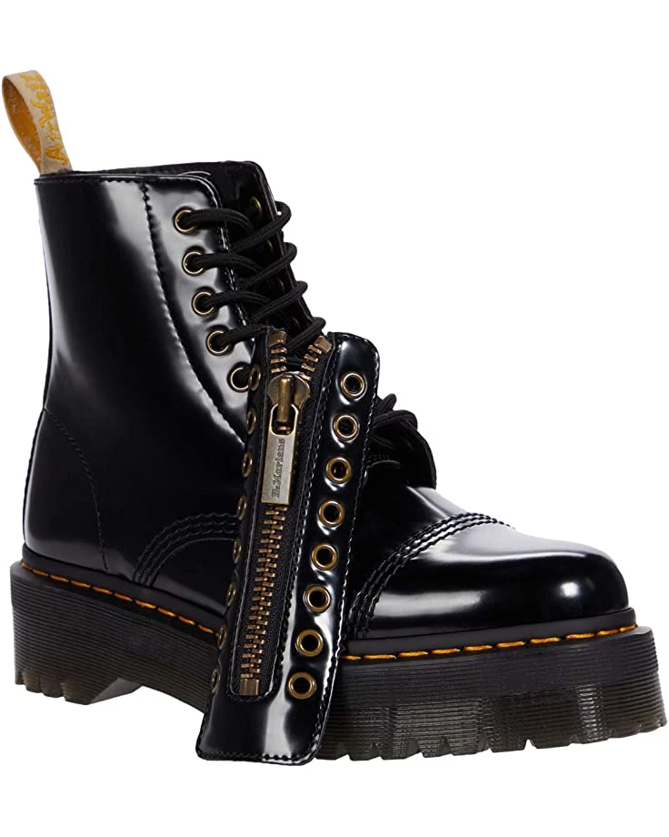 - Lace-up, eight-eyelet boot is crafted from Dr. Martens’ Oxford material; a synthetic leather substitute just like the real thing and is made using zero animal products. Boasts fabric laces and metal hardware with front zip closure for a secure fit.