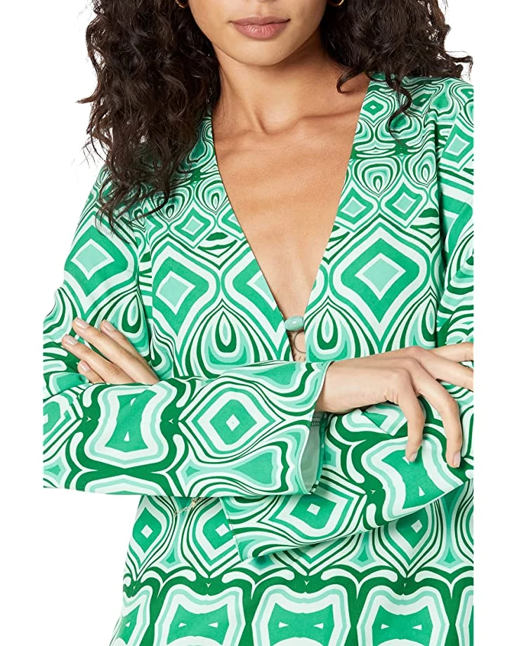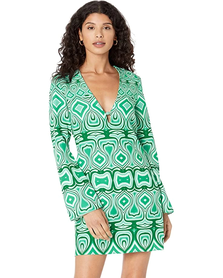 - Mini-length dress featuring a plunging V-neckline n=and long sleeves.