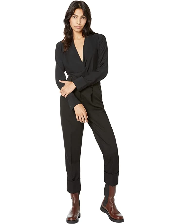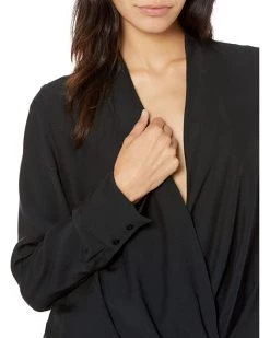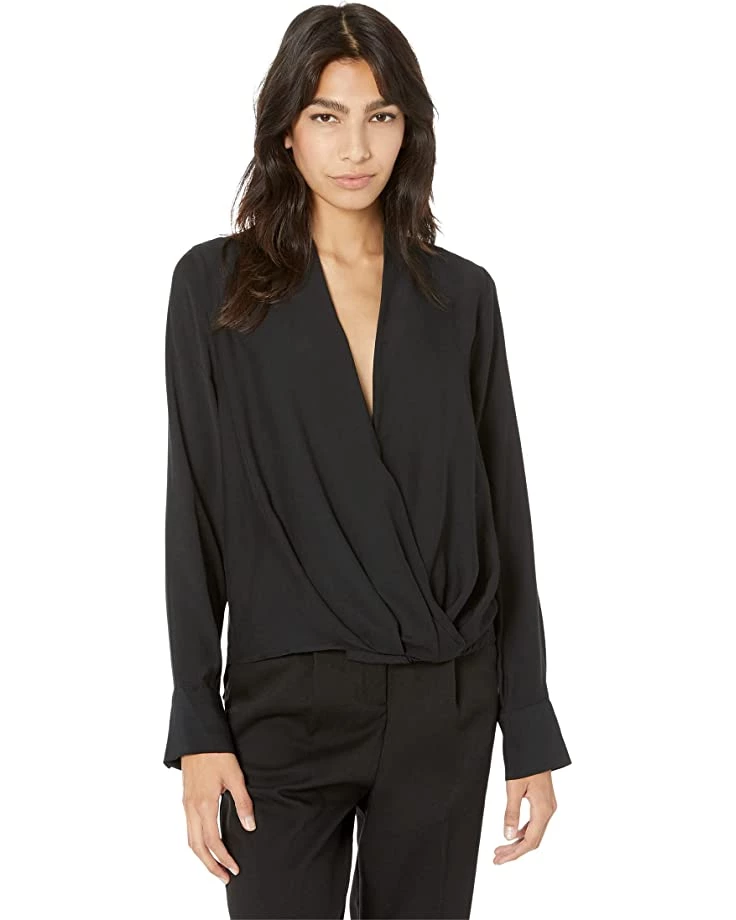 - Wrap silhouette top featuring low V-cut neckline and long sleeves with buttoned barrel cuffs.