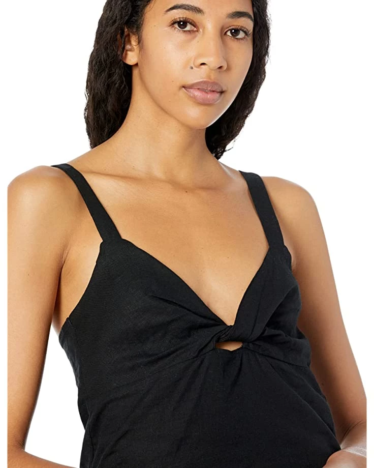 - Deep V-neckline and sleeveless construction.