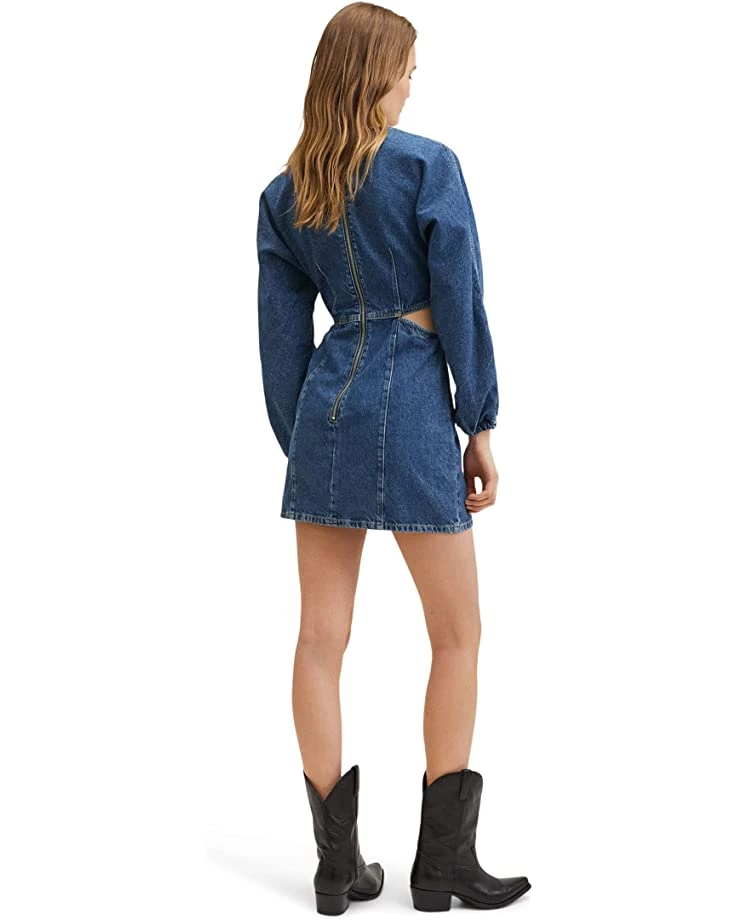 - Mini-length, denim dress featuring round neckline and long blouson sleeves.