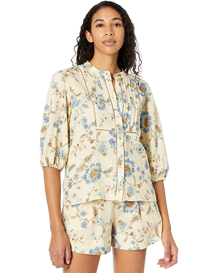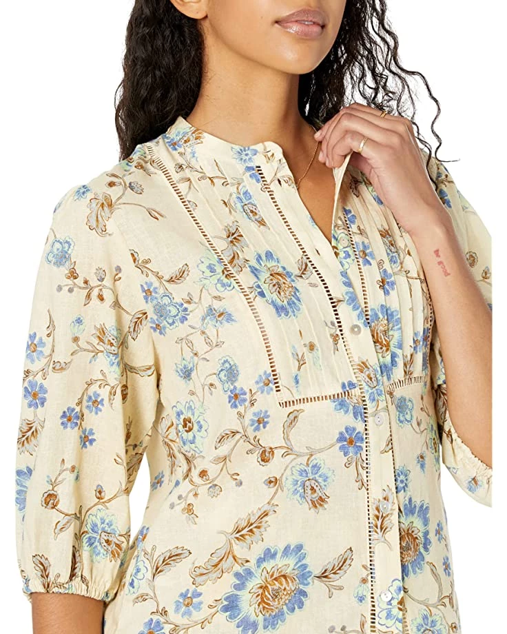 - Band collar with a three-button placket and half-length sleeves with elasticized cuffs.